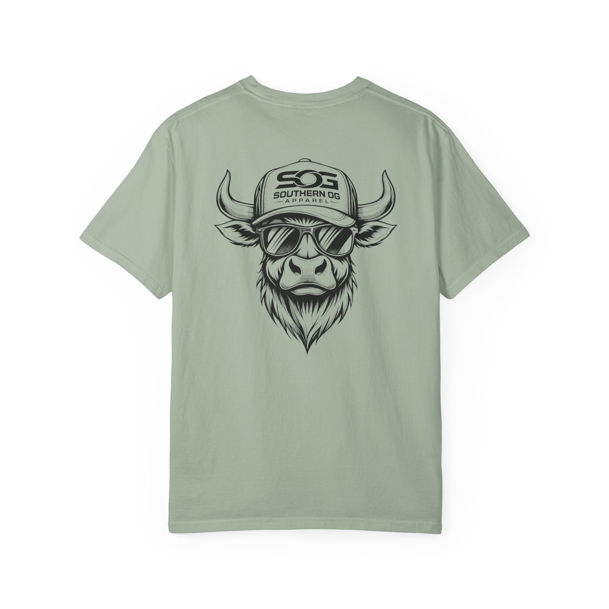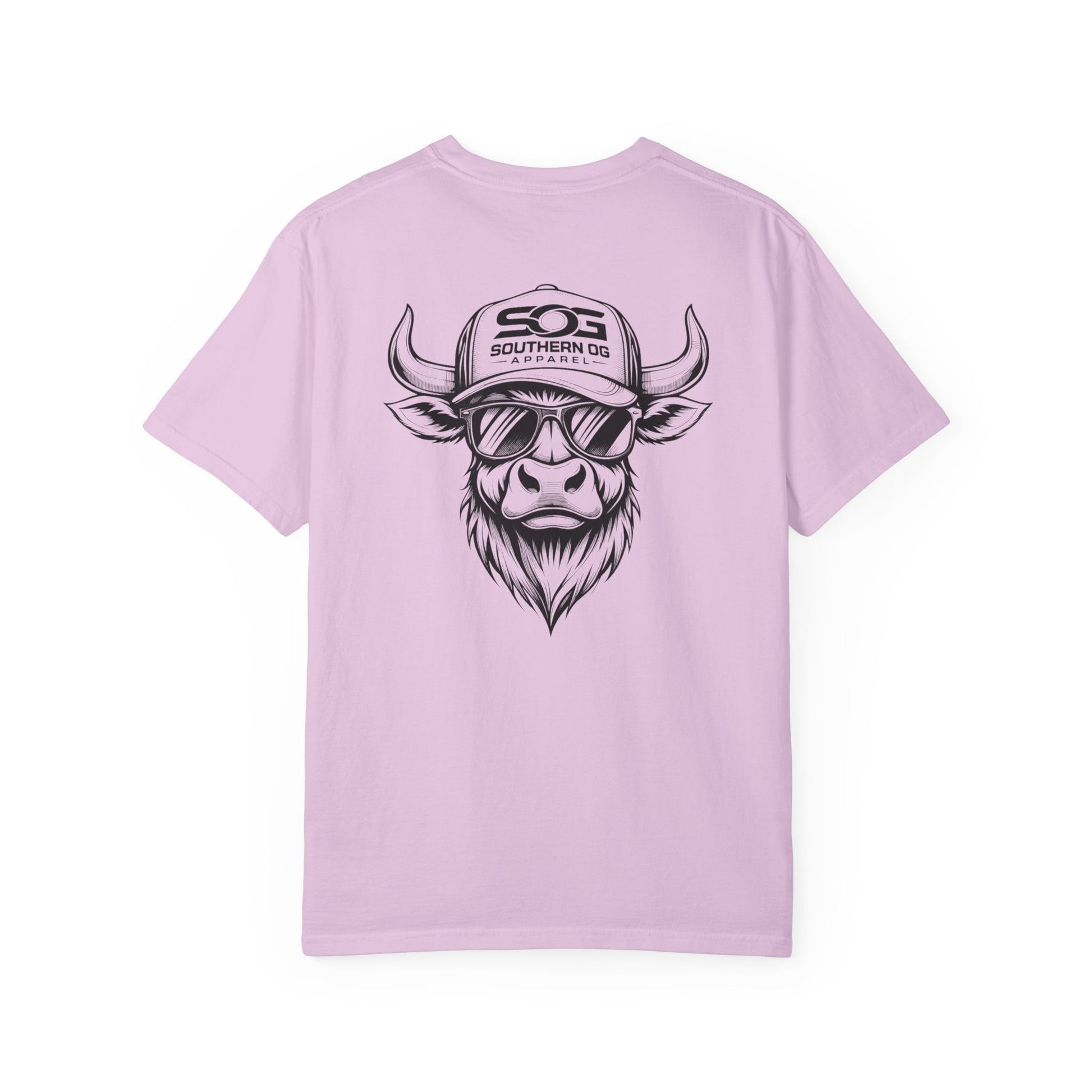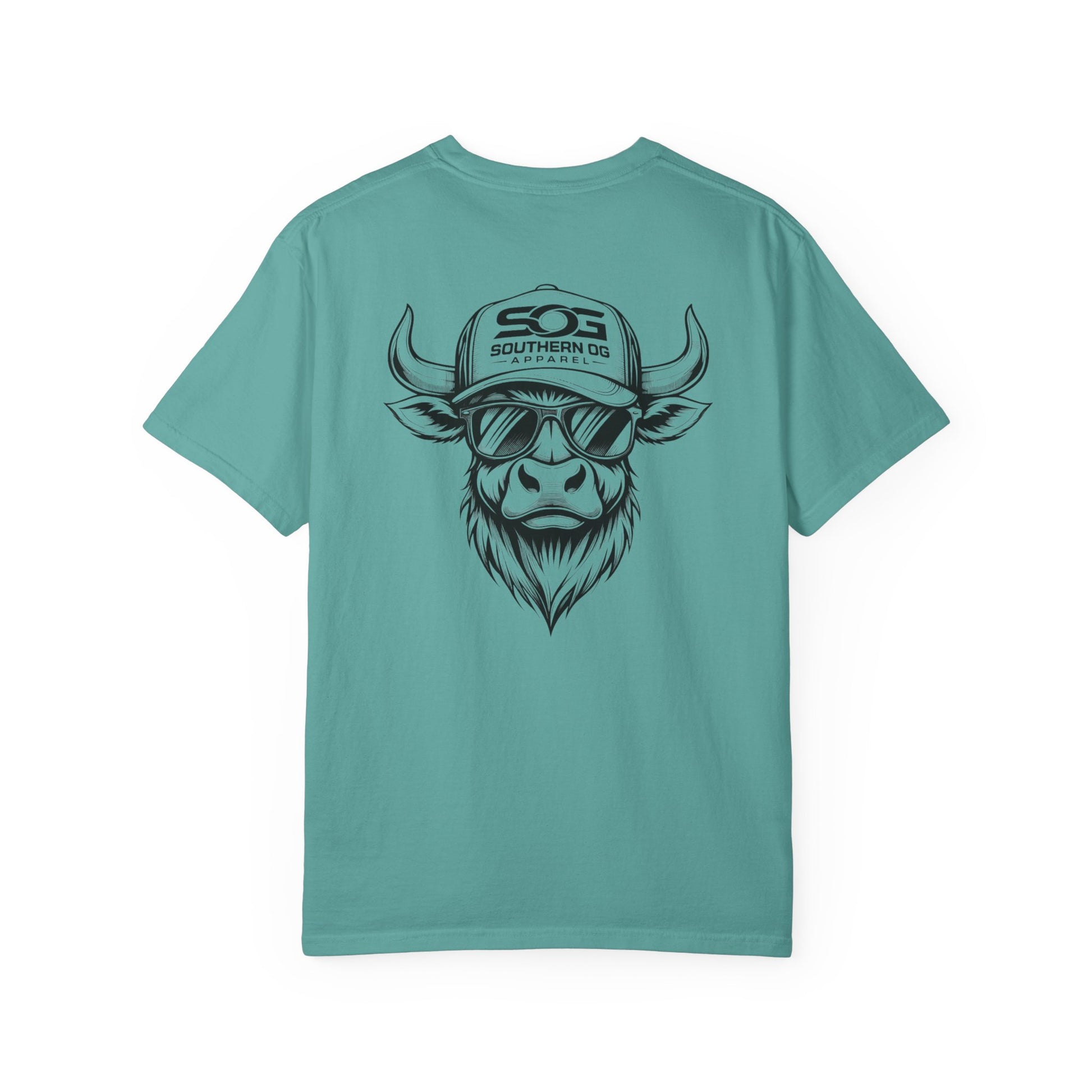 This heavyweight, garment-dyed tee brings relaxed, lived-in comfort with a bold, hand-illustrated back graphic and a subtle chest mark. The soft, post-dyed finish gives the fabric a vintage feel that deepens with every wash. Cut in a roomy, relaxed silhouette, it drapes easily over layers for warm mornings or long days outside. The artwork — a cool horned bull wearing shades and a branded cap — adds a playful, slightly rugged attitude that reads as casual confidence whether you’re on the road, at the lake, or grabbing coffee with friends. Durable double-needle stitching and a tubular, seam-free body keep the tee looking clean and built to last. Available in many colors and extended sizes, this shirt moves from campsite to city with an easy, worn-in personality.