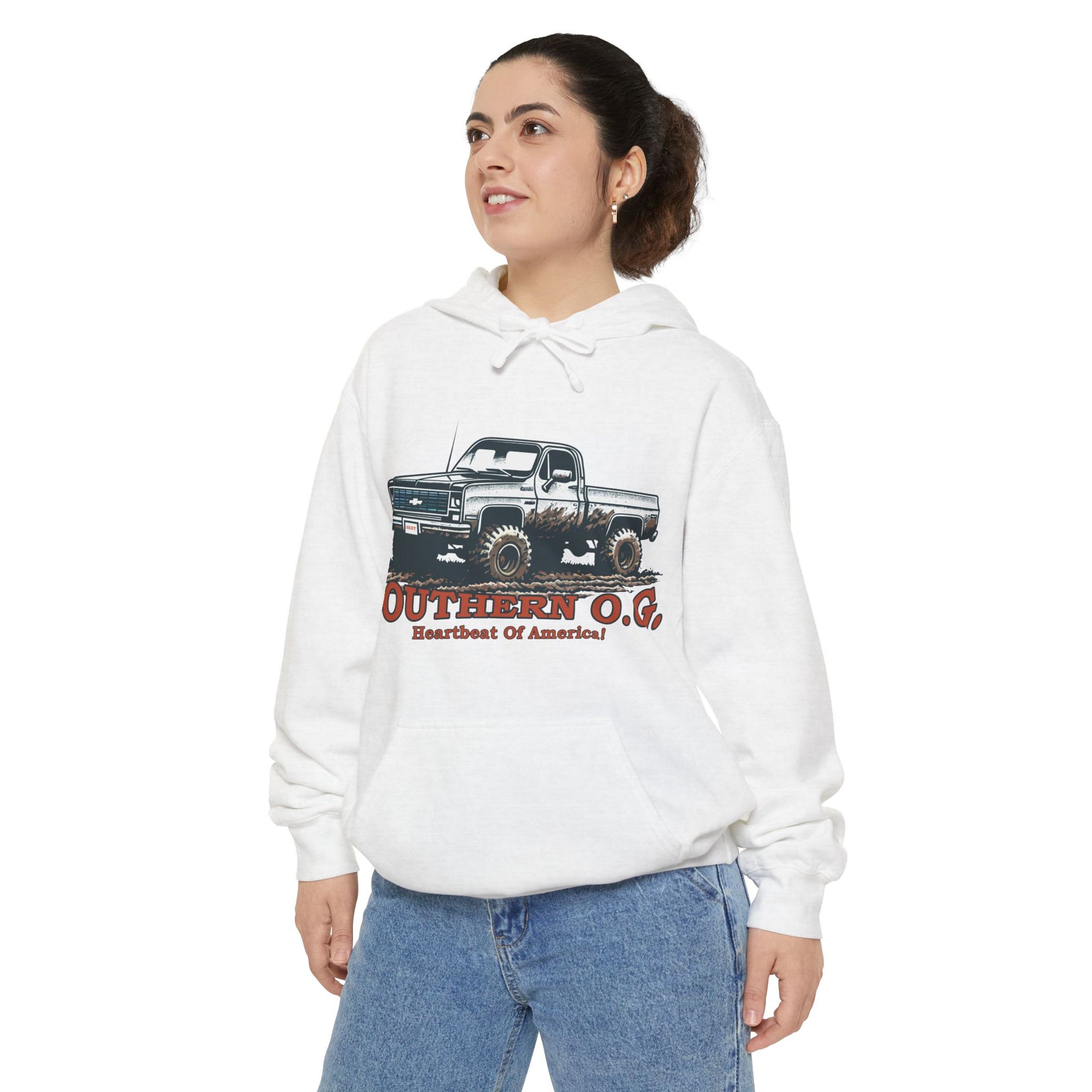 This garment-dyed hoodie carries the slow-worn charm of a long road and the grit of small-town pride. A vintage pickup sits front and center, its weathered paint and raised stance signaling Saturday-night cruises, early-morning chores, and stories traded under neon signs. The heavyweight, ringspun cotton blend feels substantial and familiar — the kind of hoodie you reach for when the dawn is still cool and the coffee is hot. Relaxed cut and ribbed cuffs let you layer without losing shape. Subtle back neck detail and a sewn-in twill label add quiet craftsmanship you notice over time. Wear it with faded jeans, a trucker cap, and a readiness for any honest conversation or porch-side sunset.